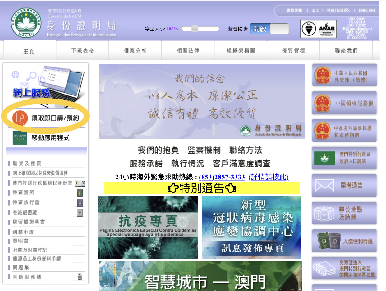 市民如需前往辦證,請於每天上午7時起透過身份證明局網頁(www.dsi.gov.mo)領取當天辦證籌號或進行預約,本局僅就緊急及特殊情況派發現場籌號,各項服務承諾亦暫緩執行,領證日期將會以短訊方式作出通知。如非緊急情況,請市民儘量延期辦理相關手續。