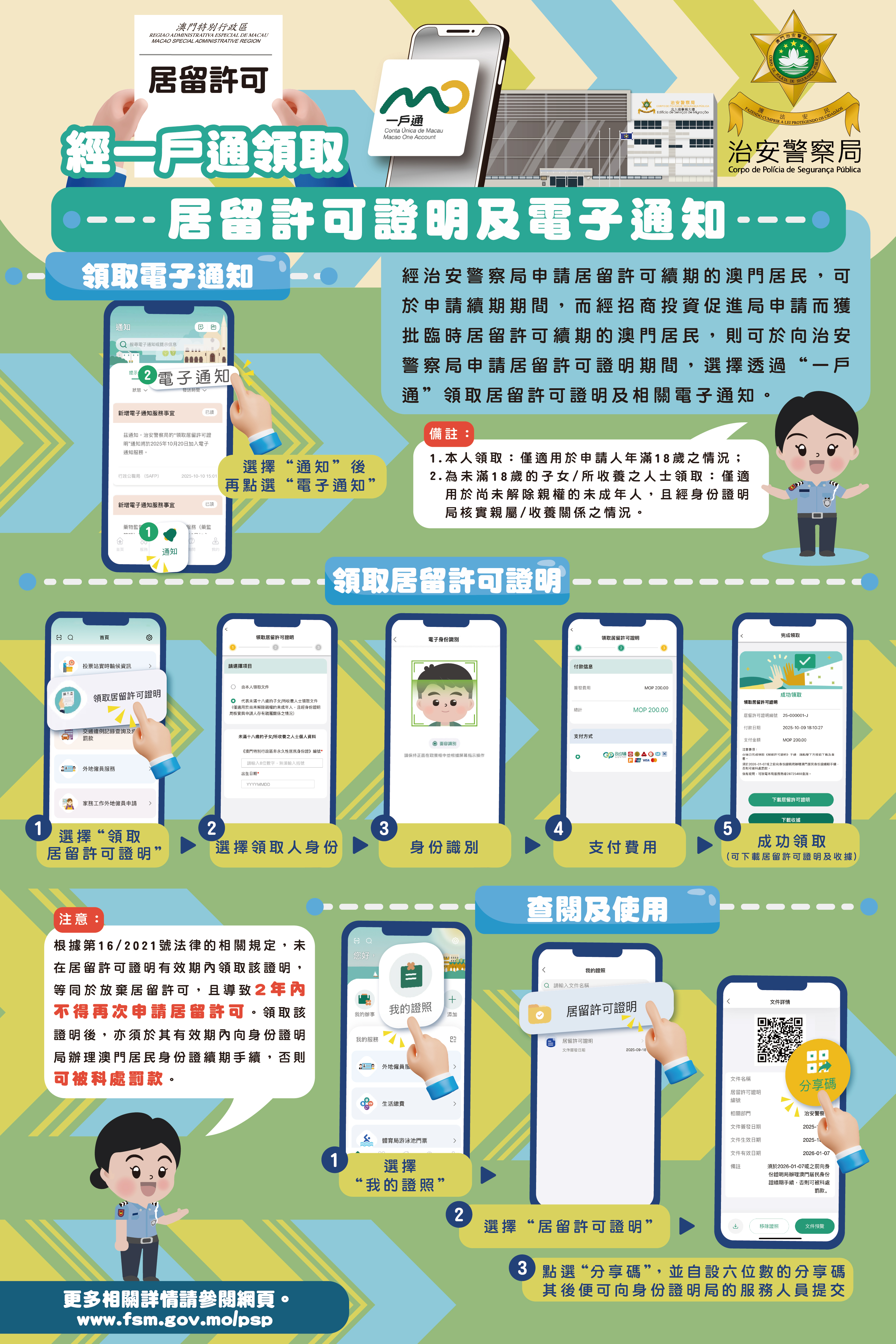 經治安警察局申請居留許可續期的澳門居民,可於申請續期期間,而經招商投資促進局申請而獲批臨時居留許可續期的澳門居民,則可於向治安警察局申請居留許可證明期間,選擇透過“一戶通”領取居留許可證明及相關電子通知。待上述申請獲得批准後,便可以透過“一戶通”領取有關證明及相關通知。倘屬經治安警察局申請續期之個案,該電子通知內容尚包括申請人獲批准居留許可續期的通知。