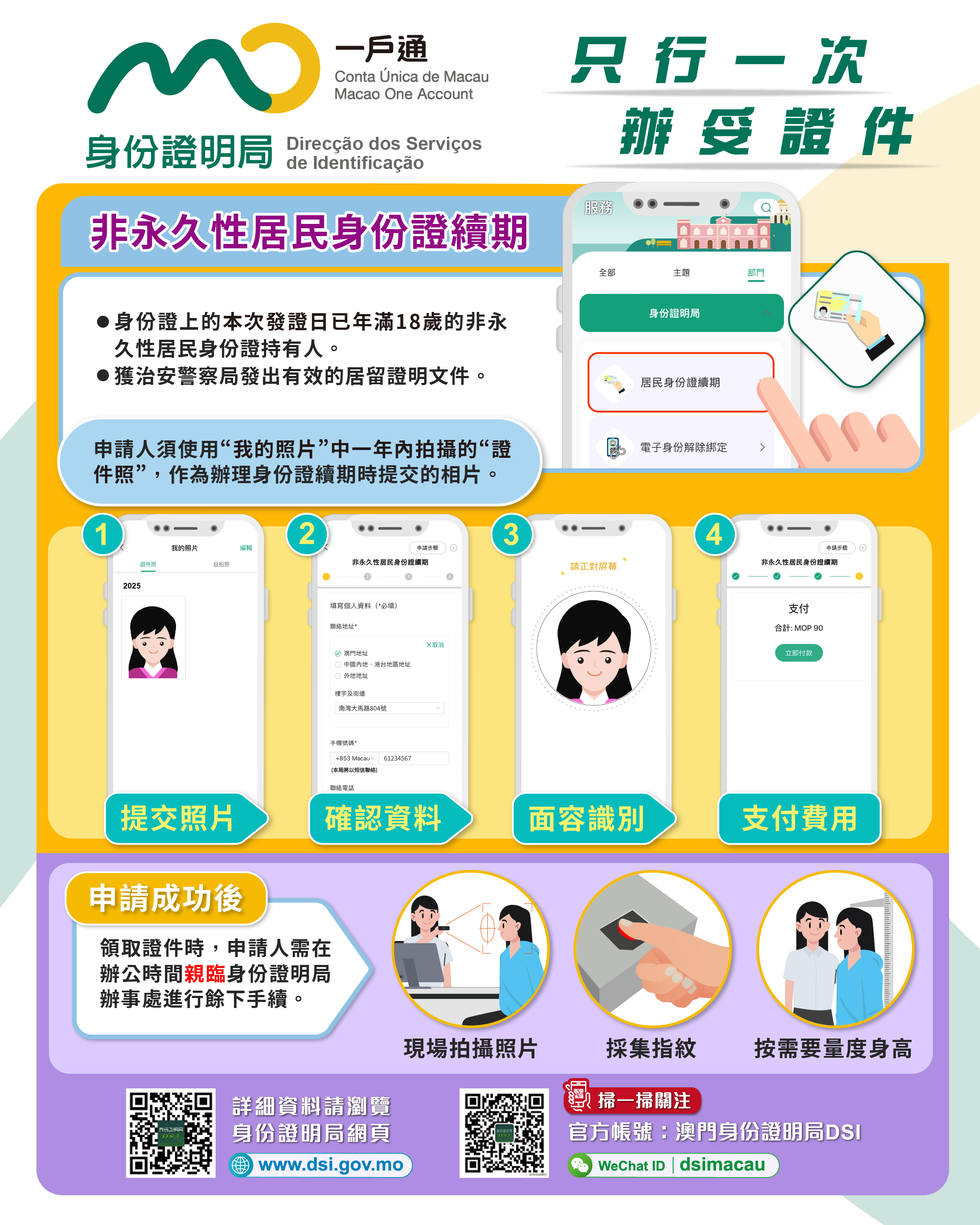 若於澳門特別行政區非永久性居民身份證的本次發證日已年滿18歲,在經“一戶通”領取的居留許可證明之有效期內,可於“一戶通”使用“居民身份證續期”服務。辦證時,申請人須使用“一戶通”內“我的照片”的“證件照”作為身份證相片,再按系統指示操作便完成申請手續。完成證件製作後,申請人只須於辦公時間親臨身份證明局領取證件時辦理餘下手續(包括現場拍攝照片、採集指模、量度身高)即可。