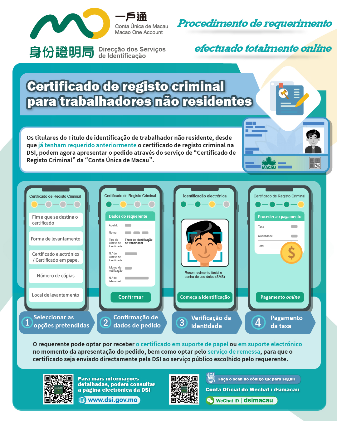 Para continuar a melhorar os serviços relacionados com a vida da população e responder activamente às necessidades dos cidadãos no tratamento de documentos online, a Direcção dos Serviços de Identificação (DSI) disponibiliza, a partir de hoje (dia 30), na “Conta Única de Macau”, o serviço de requerimento do certificado de registo criminal para trabalhadores não residentes (TNRs), concretizando assim um tratamento caracterizado por “procedimento de requerimento e de levantamento integralmente online”, para que os TNRs possam tratar do certificado de registo criminal sem necessidade de deslocação pessoal, atingindo o resultado de maior conveniência para os cidadão e simplificação administrativa.
