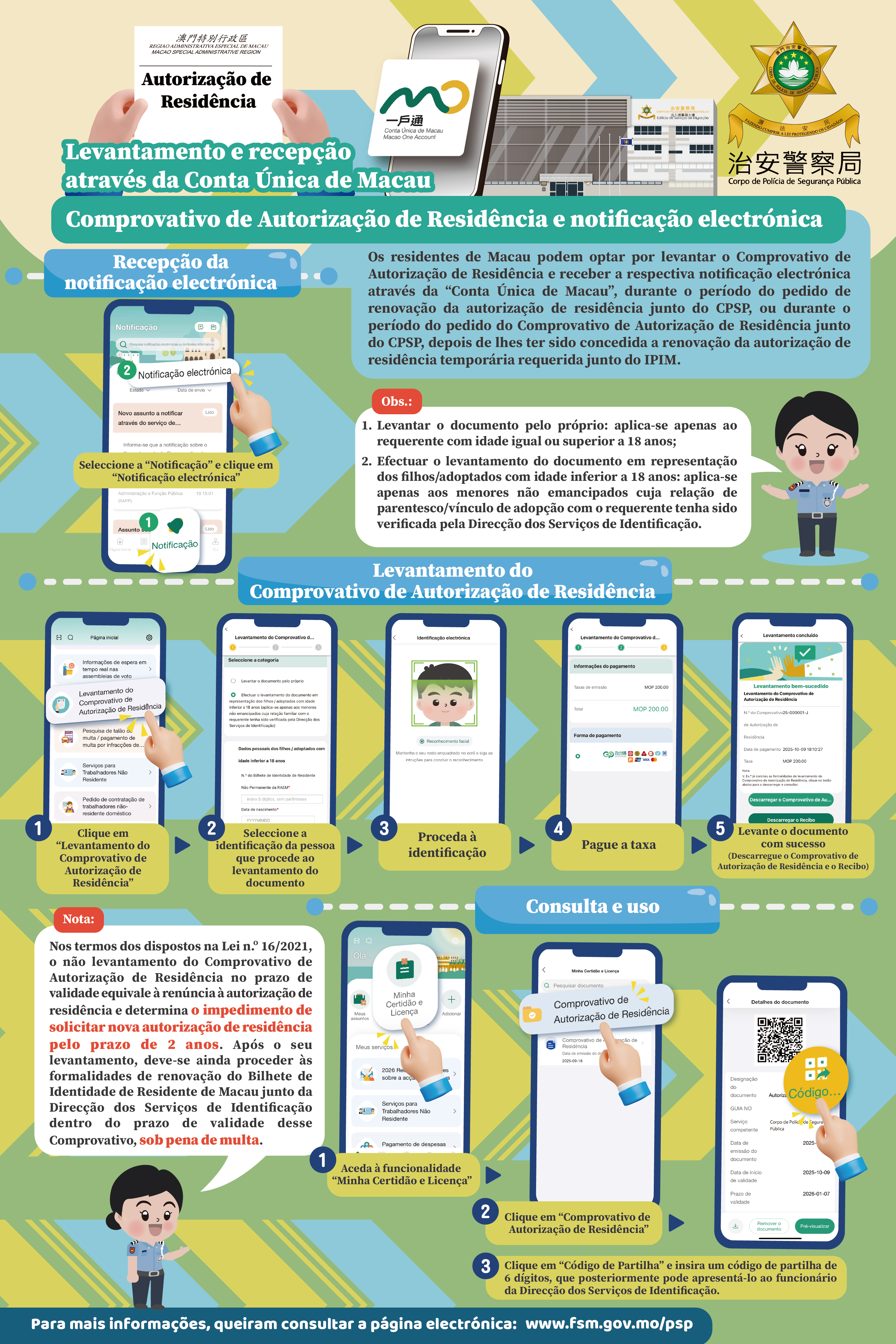 Os residentes de Macau podem optar por levantar o Comprovativo de Autorização de Residência e receber a respectiva notificação electrónica através da "Conta Única de Macau", durante o período do pedido de renovação da autorização de residência junto do CPSP, ou durante o período do pedido do Comprovativo de Autorização de Residência junto do CPSP, depois de lhes ter sido concedida a renovação da autorização de residência temporária requerida junto do Instituto de Promoção do Comércio e do Investimento. Após a aprovação dos pedidos acima referidos, o Comprovativo e a respectiva notificação estarão disponíveis para levantamento na “Conta Única de Macau”. Em caso de pedido de renovação apresentado ao CPSP, o conteúdo da notificação electrónica incluirá também a notificação de deferimento da renovação da autorização de residência do requerente.