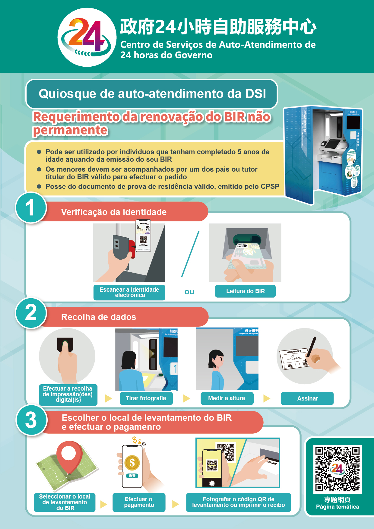 Os titulares do BIR não permanente da RAEM que tenham completado 5 anos de idade aquando da última emissão do seu BIR, podem, dentro do prazo de validade constante do Comprovativo de Autorização de Residência emitido através da “Conta Única de Macau”, tratar das formalidades de renovação do BIR em qualquer um dos Centro de Serviços de Auto-Atendimento de 24 horas do Governo, note-se que os requerentes com idade inferior a 18 anos devem ser acompanhados pelo pai, mãe ou tutor. No acto de requerimento, o requerente pode optar por usar a imagem fotográfica tirada in loco ou por entregar uma “fotografia tipo passe” guardada nas “Minhas Fotografias” da “Conta Única de Macau”, para ser impressa no BIR, depois efectuar as formalidades seguindo as instruções do sistema para concluir o requerimento.