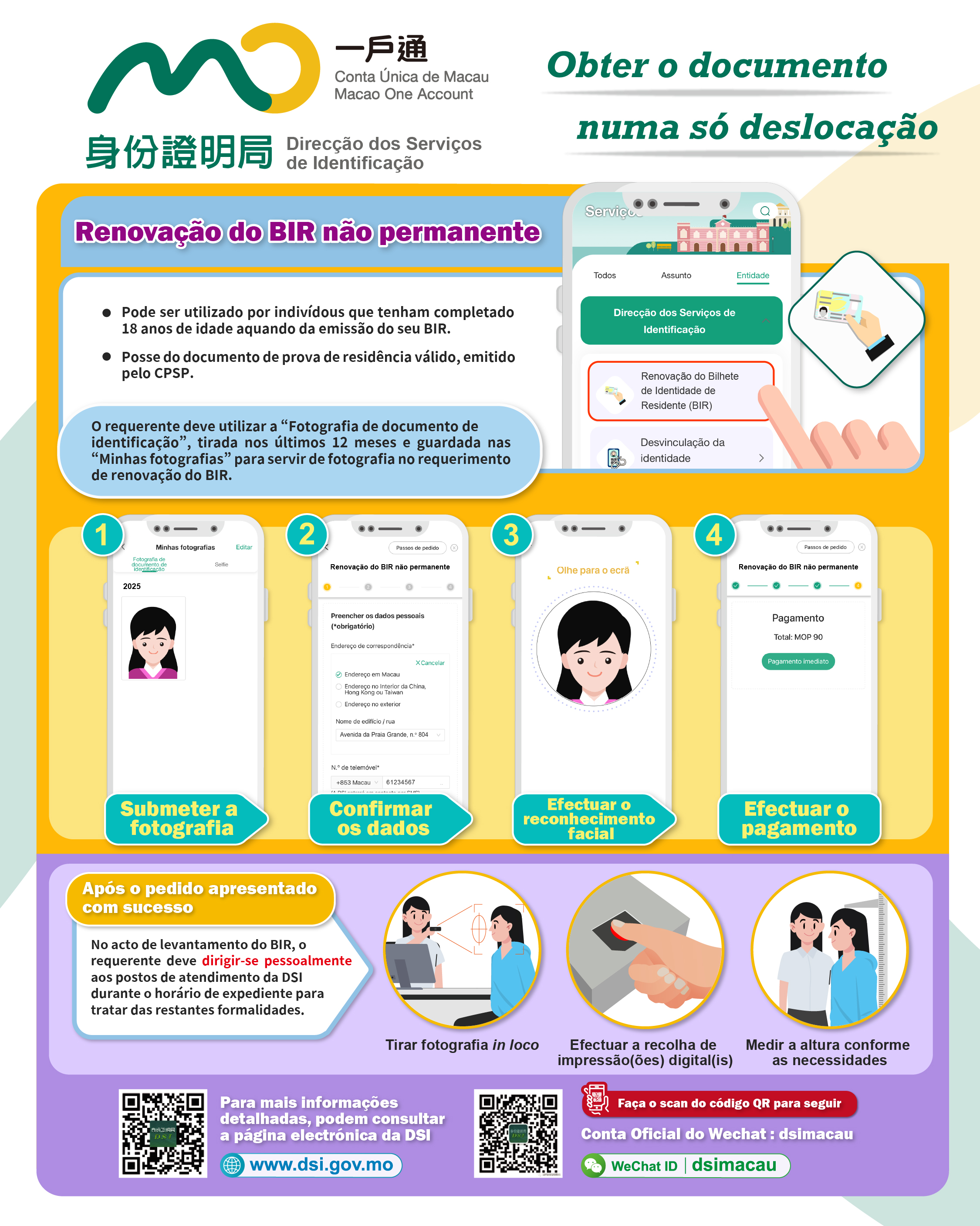 Os titulares do BIR não permanente da RAEM que tenham completado 18 anos de idade aquando da última emissão do seu BIR, podem, dentro do prazo de validade constante do Comprovativo de Autorização de Residência emitido através da “Conta Única de Macau”, utilizar o serviço de “renovação do BIR” da “Conta Única de Macau”. No acto de requerimento, o requerente deve usar uma “fotografia tipo passe” guardada nas “Minhas Fotografias” da “Conta Única de Macau”, para ser impressa no BIR, depois efectuar as formalidades seguindo as instruções do sistema para concluir o requerimento. Após concluída a produção do BIR, no acto de levantamento, o requerente deve deslocar-se pessoalmente à DSI, durante o horário de expediente, e tratar das restantes formalidades (incluindo tirar fotografia, efectuar a recolha de impressões digitais, e medir a altura in loco).