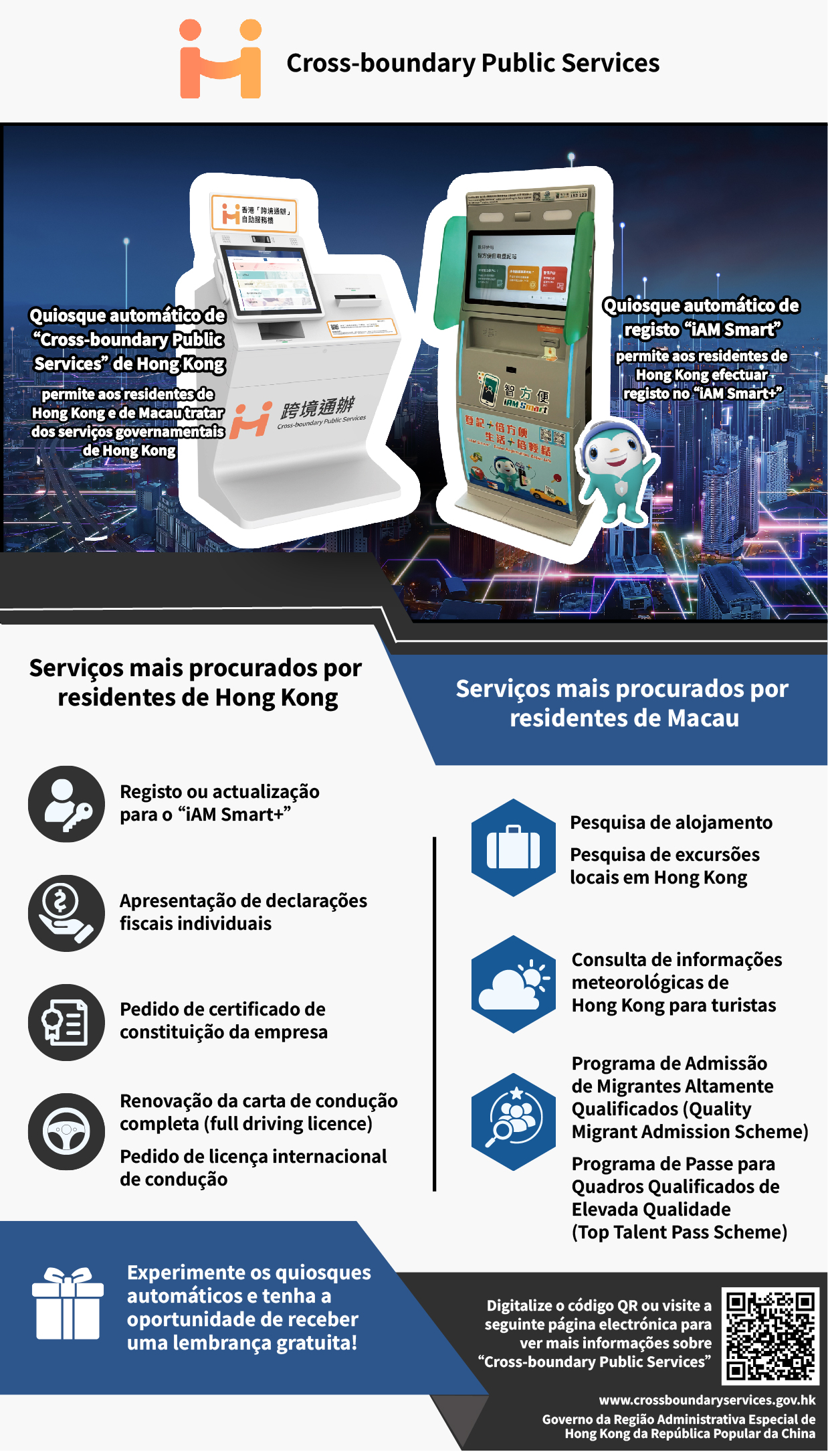 Os quiosques automáticos de “Cross-boundary Public Services” de Hong Kong disponibilizam vários serviços governamentais de Hong Kong, abrangendo os âmbitos de serviços mais utilizados pelas empresas e pelos cidadãos. Nestes quiosques, os cidadãos podem introduzir os dados, digitalizar os documentos e imprimir os resultados, permitindo-lhes tratar dos assuntos governamentais através de serviço “one stop”.