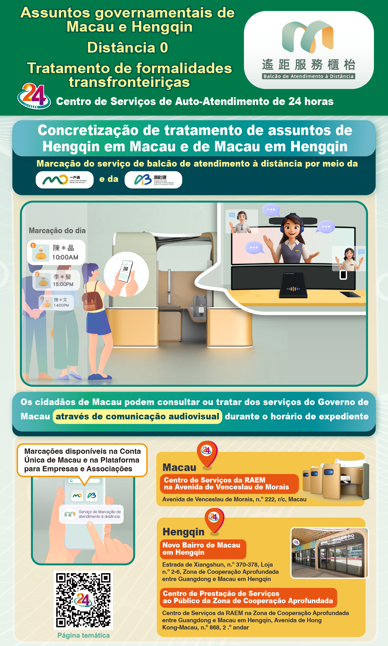 Tendo em vista a concretização da interligação dos Assuntos Governamentais de Macau e Hengqin com o “Tratamento directo das formalidades transfronteiriças”, os Governos da RAEM e da Zona de Cooperação Aprofundada empenharam-se em colaborar no sentido de promover o “Tratamento de assuntos de Hengqin em Macau e de Macau em Hengqin” por meio do balcão de atendimento à distância.